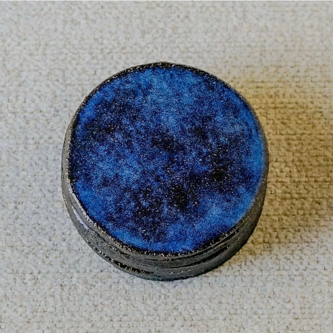 Hand built stoneware made with dark horse clay. Smooth glaze finish, hand painted on with a brush.