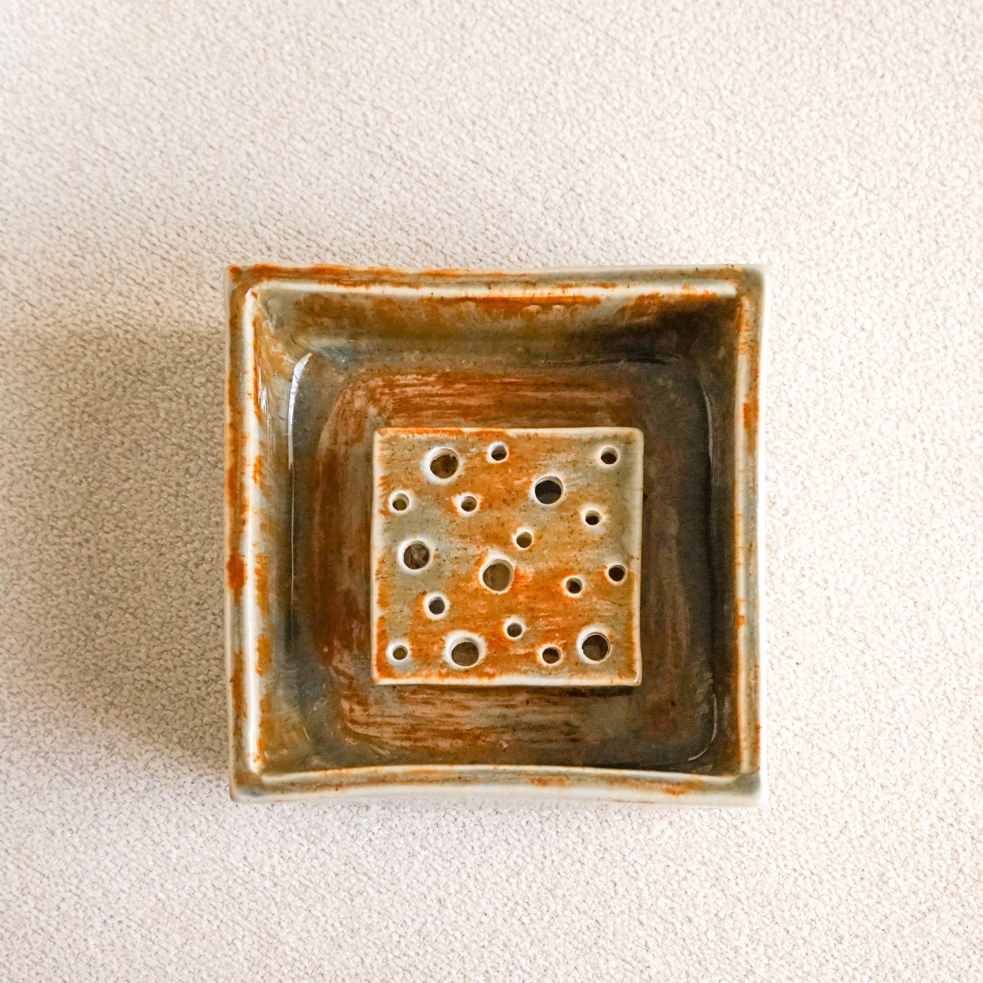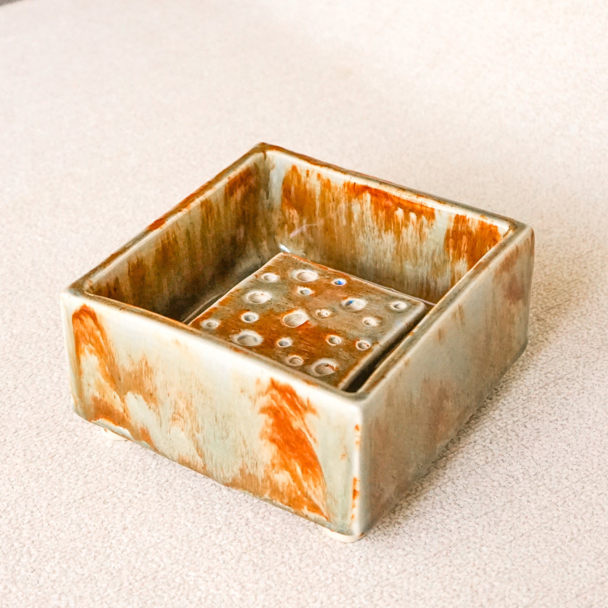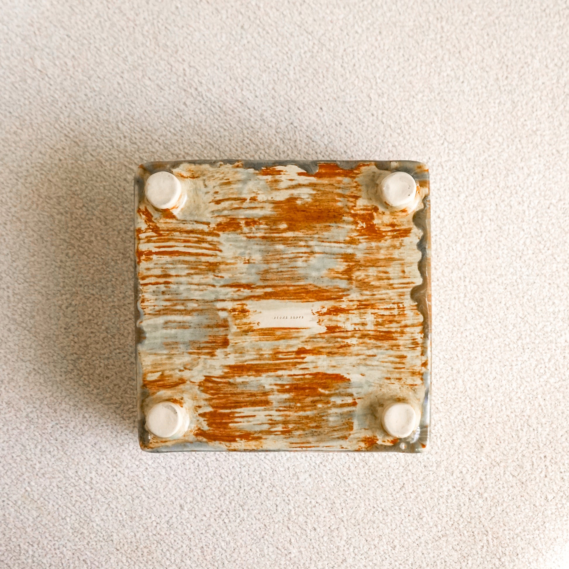 Hand built stoneware made with B-mix clay. Smooth glaze finish, hand painted on with a brush.
