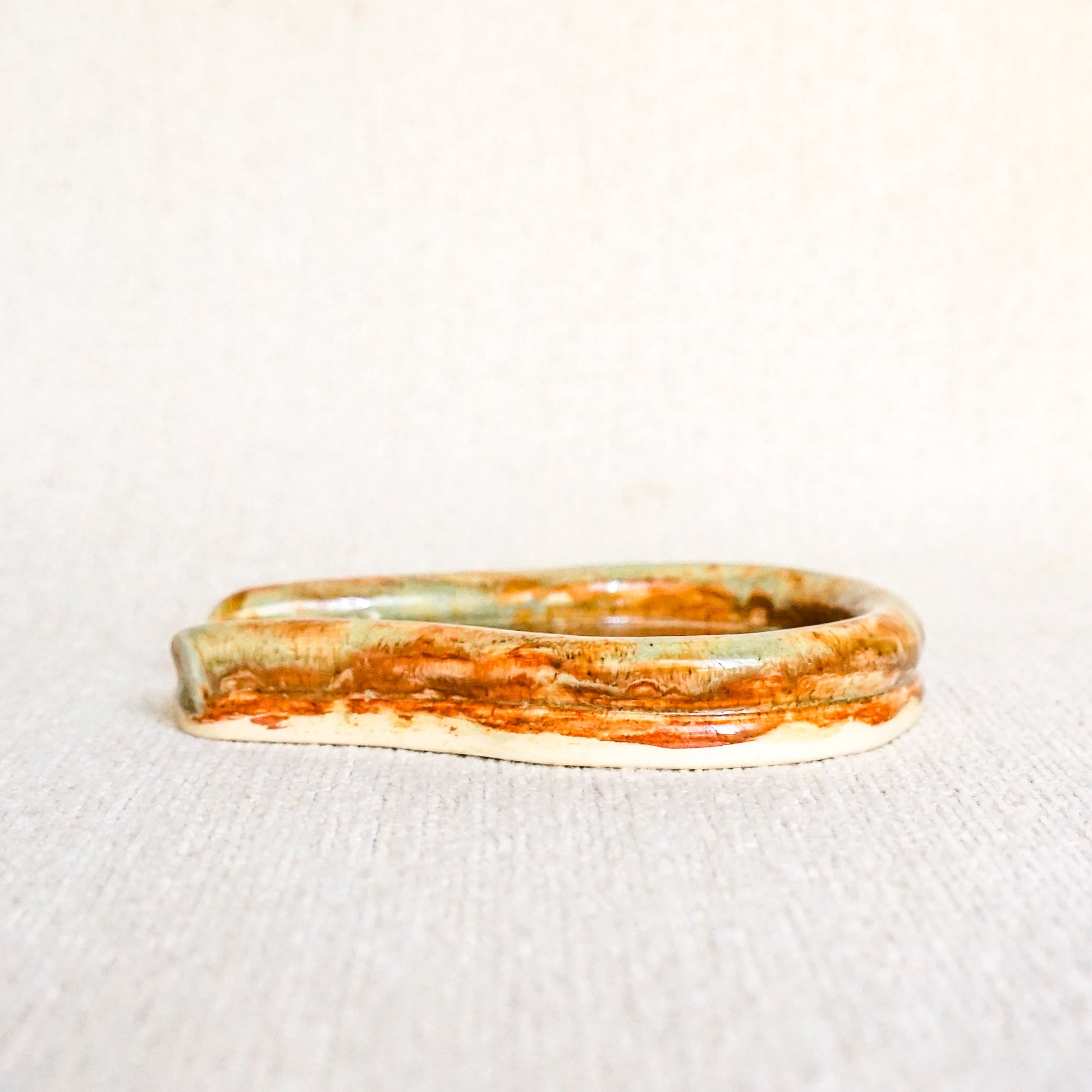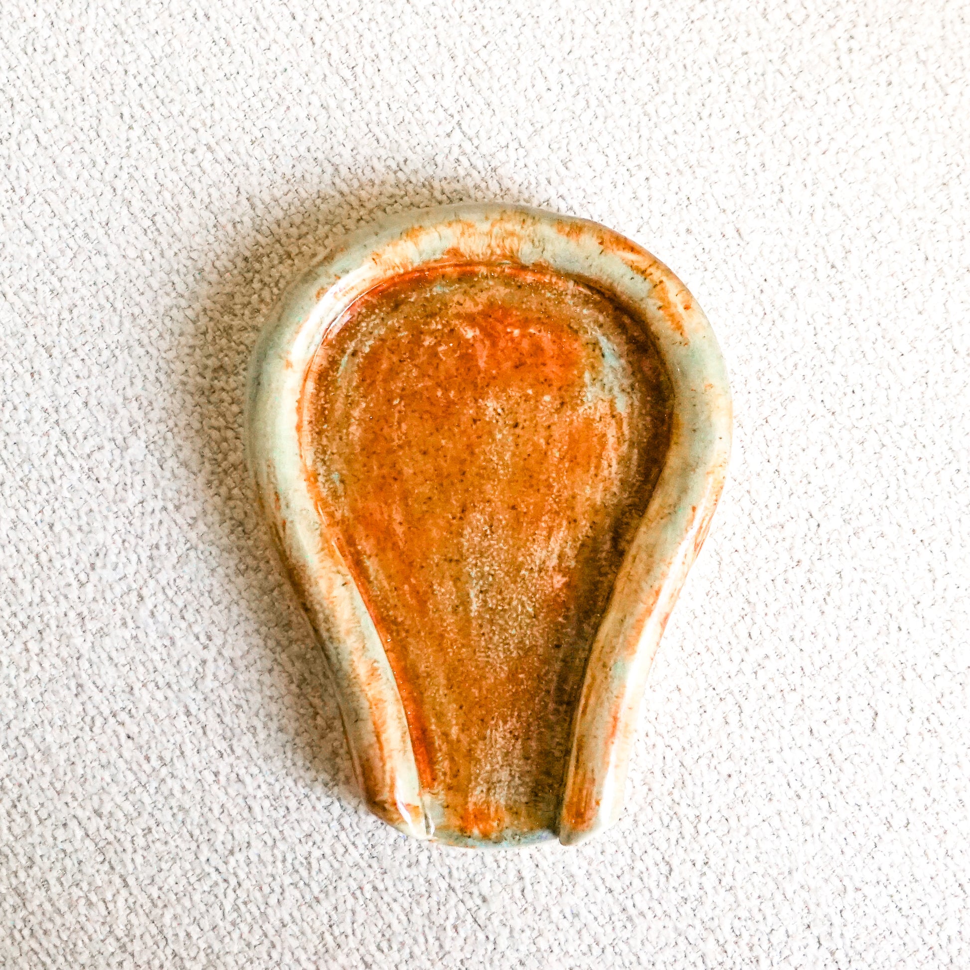 A hand painted spoon rest to add a pop of color to your kitchen. Each spoon rest is two toned and one of a kind.